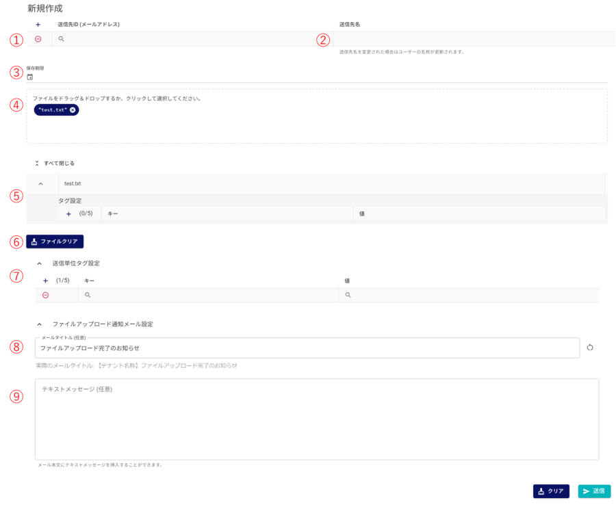 送信するファイルを、管理・分類しやすくするために、キーと値というペアを使ってタグを設定することができます。