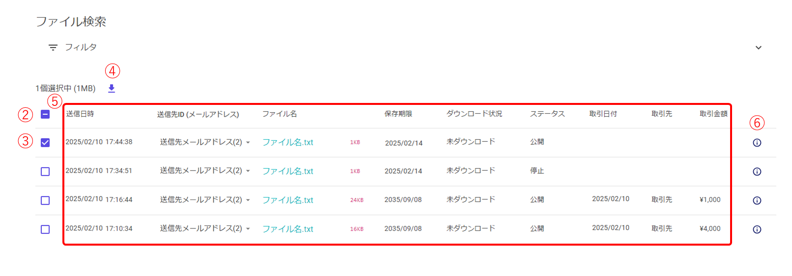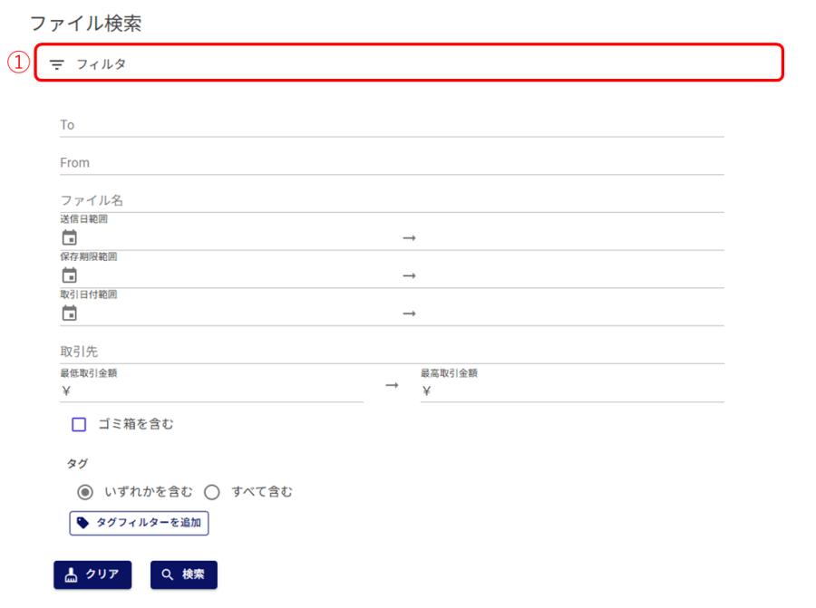 • 0を入力した場合は、取引金額が0円のファイルが絞り込まれます。
