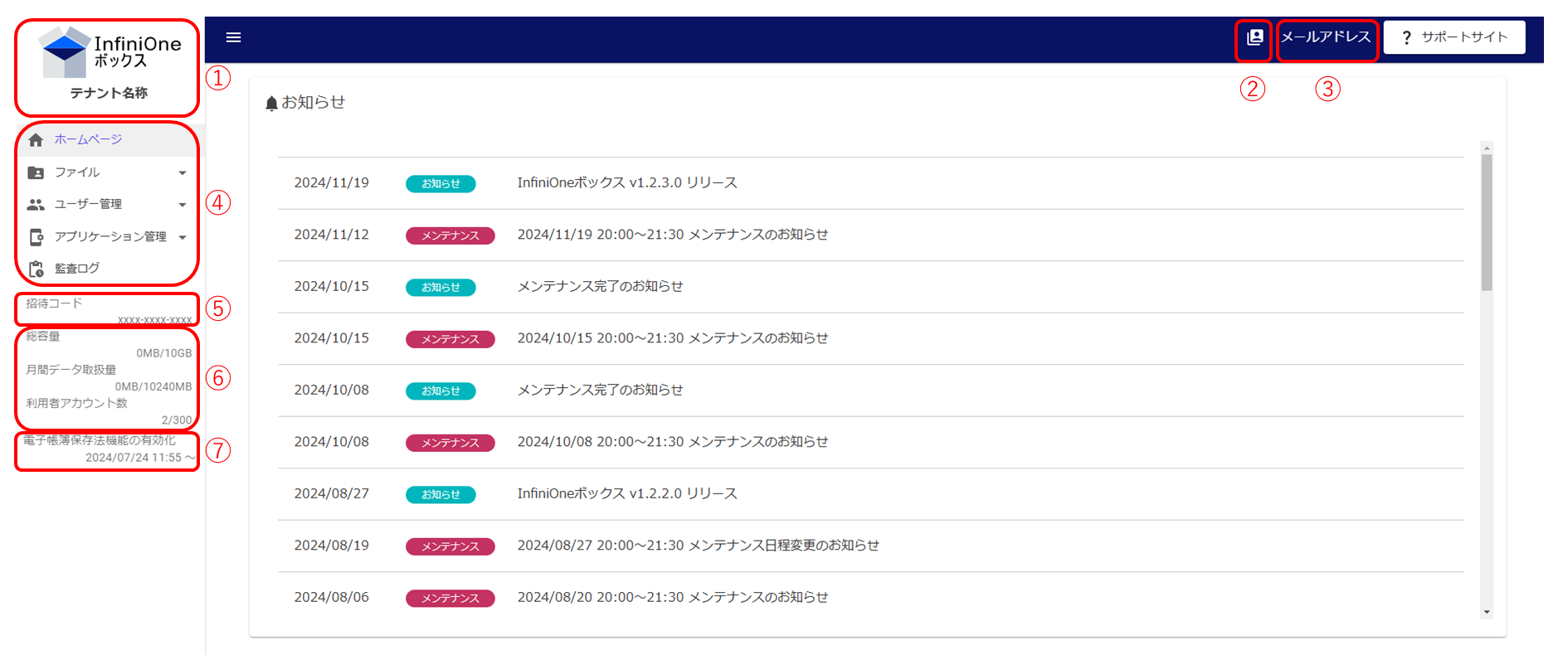| メニュー | テナント管理者 | テナントユーザー | ゲストユーザー |